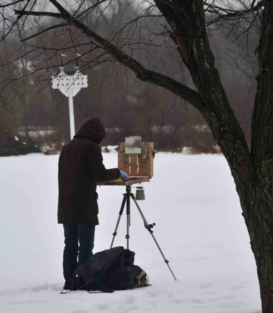 snow and artists had to keep wiping the snow from their canvases.