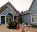 Patrons of the Rachel Kohl Library in Concord Township had to bypass cones and debris as a crew from R Hudecheck Roofing worked to replace the roof, which had been damaged by hail.