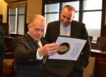 As Chester County Detective Lt. Michael McGinnis looks on, recently retired Chief Detective James Vito peruses a photo book presented to him following his selection as 2015 Detective of the Year.