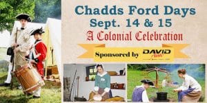 • Chadds Ford Days is back, after a year hiatus. It returns this weekend, Saturday and Sunday, Sept. 14 and 15, from 10 a.m. to 5 p.m., at the Chadds Ford Historical Society grounds on Creek Road. This family-friendly event celebrates the history of Chadds Ford and the Historical Society is looking forward to greeting many members of our society and the community. Admission is $10 for adults, $5 for kids 7-17 and free for those 6 and younger and for CFHS members.