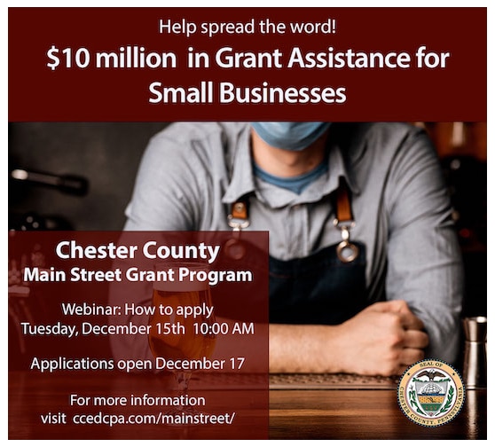 To assist in the application process, the CCEDC is hosting a webinar on Dec. 15, at 10 a.m. Business owners wishing to learn more about the grant program and ask questions about how to apply, can join the webinar at https://ccedcpa.com/mainstreet/. The webinar will also be live-streamed on the Chester Count Government Facebook page and will be recorded for viewing.