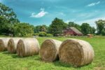 Hay bales dry under a blue sky in front of a barn missing part of its roof.