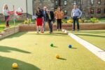 Council Co-Vice Chairman John Crossan tries his hand at bocce. Waiting her turn, to the left of Crossan is Councilmember Vinita Deshmukh. Behind them are Co-Vice President John Gillespie and Councilmember Colleen Morrone. Looking on are township Manager Amanda Serock, far left, and Director of Public Works Dan Moyer.