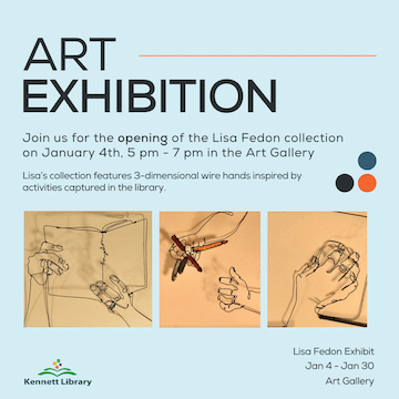 The Lisa Fedon Exhibit opens Jan. 4 at the Art Gallery at Kennett Library with a reception from 5 to 7 pm. The Kennett Library at Bayard Taylor Commons is located at 320 East State Street, Kennett Square. More information can be found at KennettLibrary.org.