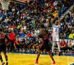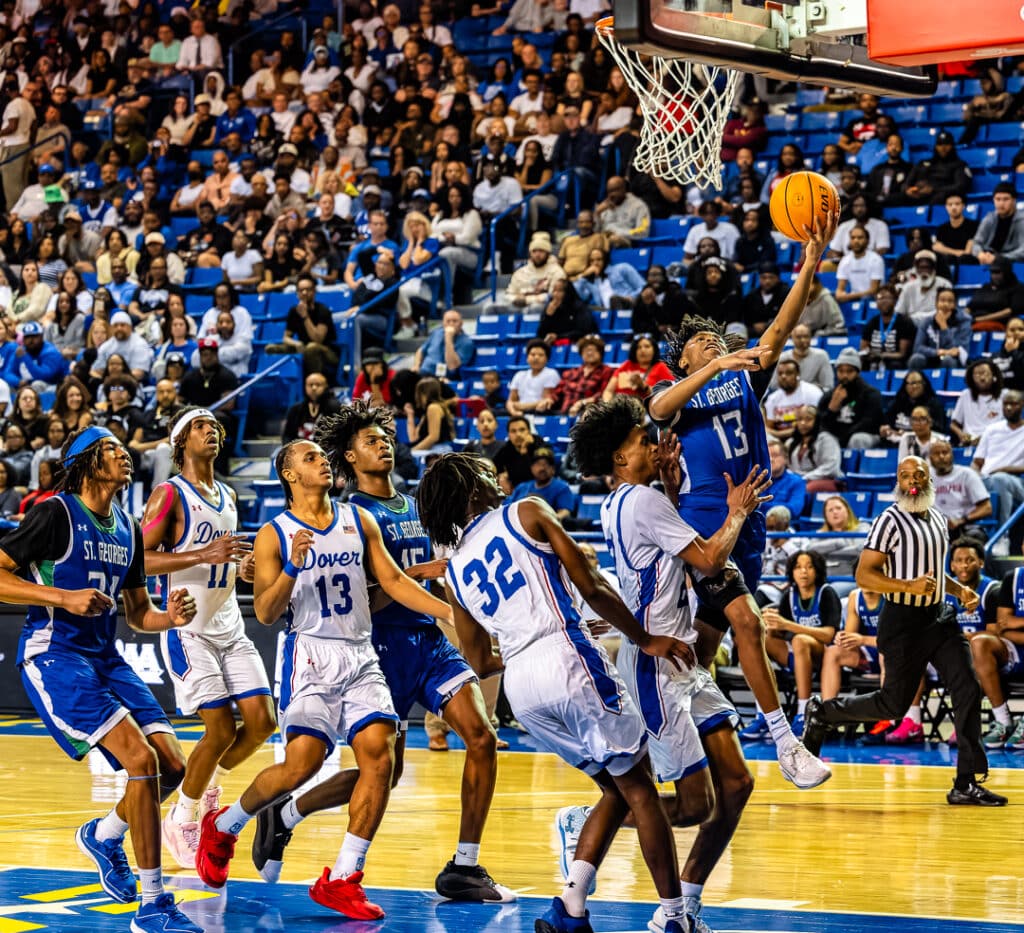 St. Georges junior Jayden Reid skys above the Dover defense attempting to finish at the rim. Photo Credit: Dave Reeder