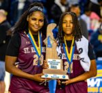 St. Elizabeth seniors Skylar Bolden (left) and Za’Mylah Seda-Owens (right) pose with the championship trophy after winning the 2026 DIAA girls basketball state championship. Photo Credit: Dave Reeder