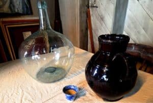 The studio was not just home to easels, brushes, and palettes, but home to props for his paintings: Western saddles, smooth- bored muskets, a massive and intricate model of a square-rigged sailing ship; a flax wheel, gorgeous frames waiting to be filled; a full-sized birch bark canoe, and more. But there, on an almost hidden corner table next to an easel with the painting, was a familiar large green glass bottle. My favorite NC Wyeth had come to life. The Dusty Bottle (1924).