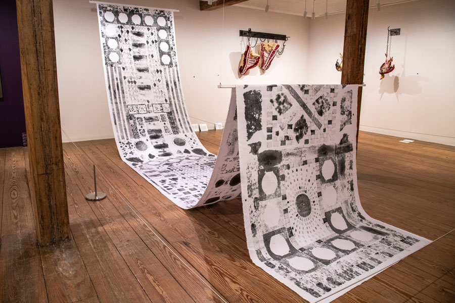 Artist Sto Len has a large piece on display, “Impressions for Coastal Constellation Alignment: Potomac River, Virginia.” Here, the artist uses a Japanese technique of monoprinting onto a large piece of fabric. What he chose to print on that fabric were pieces of trash pulled from the Potomac River.