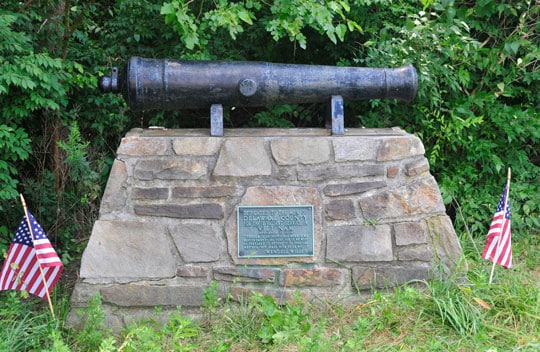 The monument, with its stone pedestal in need of repair, isn’t visible from the road because it’s blocked by brush. Steve Quigley, of Concord Towing, knew of the cannon, but forgot about it until he came across the monument while he and his son were unloading some equipment two years ago.