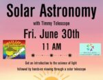•Kids can get a lesson in solar astronomy and the science of light at the Rachel Kohl Library on Friday, June 30 from 11 a.m. to 1 p.m. The event includes hands-on viewing with a solar telescope.