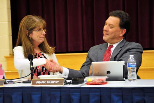 Do said: “While we might have significant philosophical differences…I have come to recognize that Frank cares deeply about the district and all its constituents, from taxpayers to the teachers to the children. I found him to be thoughtful, very easy to work with even when we disagree and an asset to this board.” (See photo.)