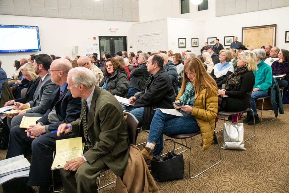 The meeting room in Concord Township's municipal building is packed with people listening to testimony in a zoning hearing for Retail Sites.