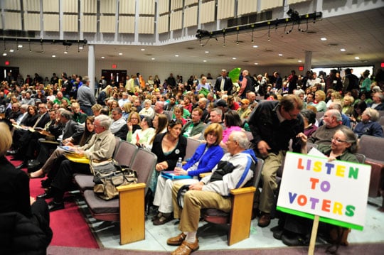 The audience, comprised of many people from the Save the Valley group who want the plan shut down, raised green cards when Von Spreckelsen and Michael made their points, while holding up red cards when Jaros and his witnesses made theirs. They also applauded for their side and jeered, booed or made other calls when the applicant’s representatives spoke. At one point, Donaghue told audience members not to shout out or they would be asked to leave.